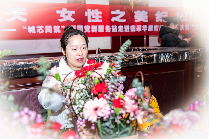 活動(dòng)現(xiàn)場(chǎng)氣氛熱烈而融洽,居民們邊向老師學(xué)習(xí)邊交流,互相分享自己的插花心得。一朵朵美麗的花朵在大家的手中綻放,仿佛也在訴說(shuō)著女性的堅(jiān)韌與美麗。