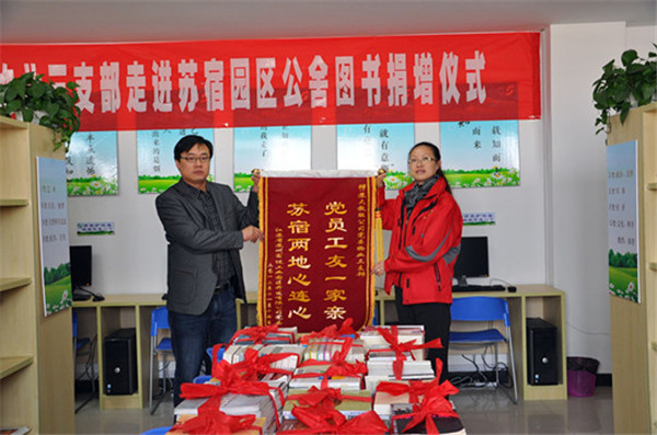 活動現(xiàn)場,陳彤彤代表蘇大教服集團黨委物業(yè)三支部捐贈了《紅樓夢》、《中國文學(xué)》、《管理學(xué)》等書籍20余種310冊和羽毛球拍、乒乓球拍等文體用品;張驥代表建發(fā)公司向蘇大教服集團黨委物業(yè)三支部贈送了題為“黨員工友一家親,蘇宿兩地心連心”的錦旗,以示感謝。
