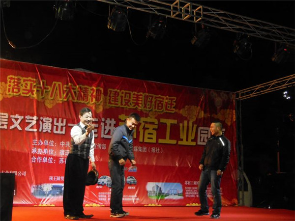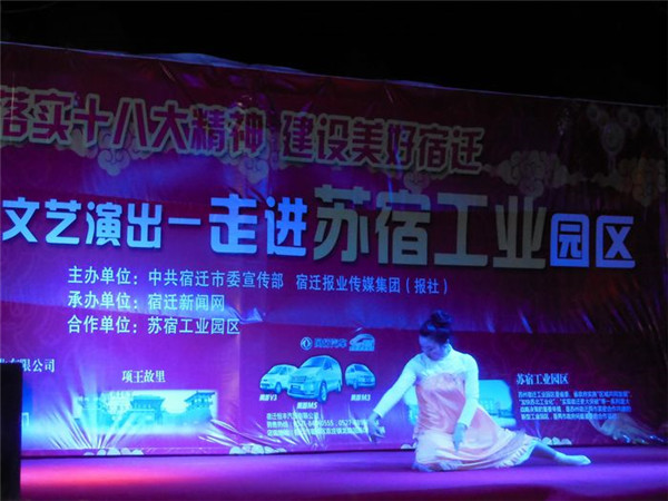 落實(shí)十八大精神 建設(shè)美好宿遷”服務(wù)基層文藝演出由市委宣傳部、宿遷報(bào)業(yè)傳媒集團(tuán)(報(bào)社)主辦,宿遷新聞網(wǎng)承辦,旨在深入宣傳黨的十八大和市委四屆三次全體(擴(kuò)大)會(huì)議精神,落實(shí)文化惠民措施,將走進(jìn)全市100余個(gè)鄉(xiāng)鎮(zhèn)、社區(qū),將包括歌舞、雜技、曲藝、戲劇等內(nèi)容的百場(chǎng)精彩演出奉獻(xiàn)給廣大基層群眾,此次受園區(qū)邀請(qǐng),專程赴園區(qū)公舍演出,為廣大工友及周邊居民帶來了一場(chǎng)精彩的文化大餐。