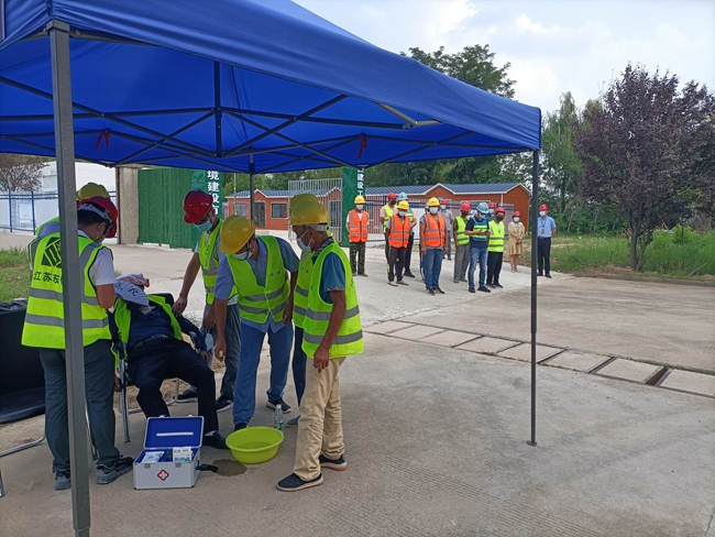 8月19日,開(kāi)發(fā)公司結(jié)合夏季高溫天氣狀況在園區(qū)通湖大道電纜溝項(xiàng)目部組織高溫中暑應(yīng)急演練。