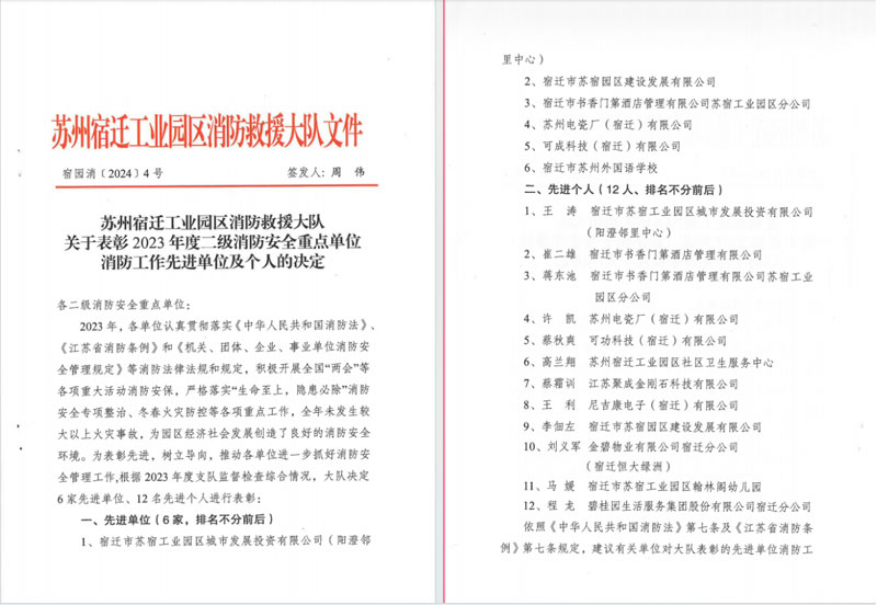 近期,陽(yáng)澄鄰里中心獲評(píng)園區(qū)“2023年度消防安全管理工作先進(jìn)單位”,公司消防安全管理員王濤獲得園區(qū)“2023年度消防安全管理工作先進(jìn)個(gè)人”。