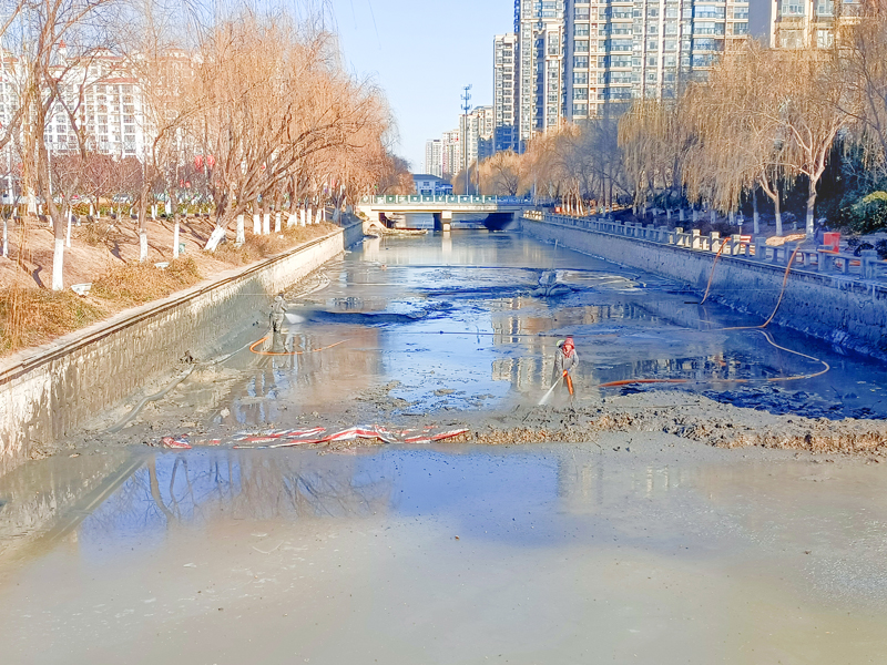 園區(qū)利民河全長(zhǎng)1.1公里、寬20米,為區(qū)內(nèi)景觀河。經(jīng)前期摸排,河道內(nèi)淤泥沉積較多,影響河道自凈能力。城發(fā)公司克服冬季氣溫低、斷面長(zhǎng)、施工難等不利因素,采用泥漿泵配合高壓水槍射水,管道封閉運(yùn)輸?shù)氖┕し椒ǎ謇碛倌嗉s8500立方米,高效完成河道清淤工作。