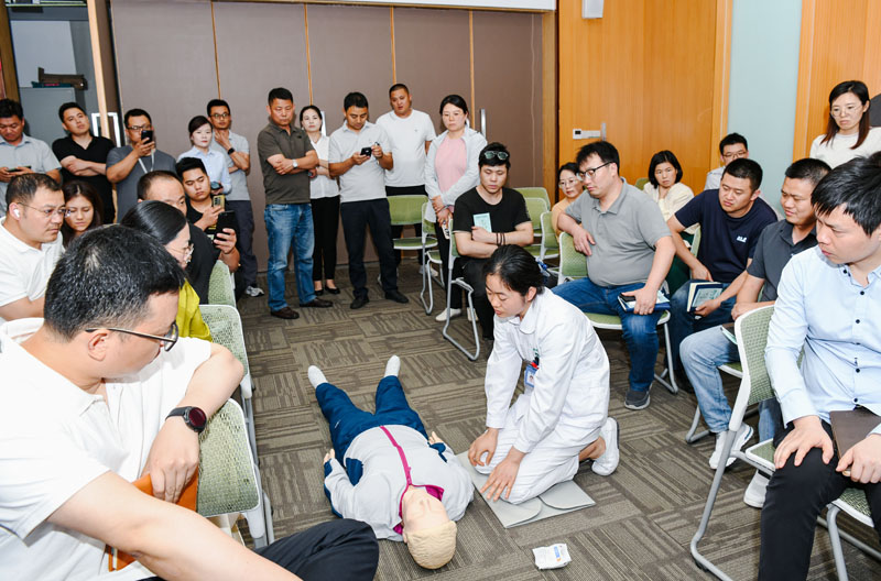 在第一階段活動現(xiàn)場,醫(yī)護人員通過PPT的形式,為大家詳細講解了心肺復蘇、AED使用、海姆立克急救法的操作要點和注意事項,以及夏季高溫中暑的自救互救應急處理知識,并通過互動方式一對一指導教學,鍛煉了實際操作能力。隨后,醫(yī)護人員也為在場職工進行血壓、血糖等項目測量,中醫(yī)把脈問診、家庭醫(yī)生簽約等便民服務,參加此次活動的職工紛紛表示受益匪淺。