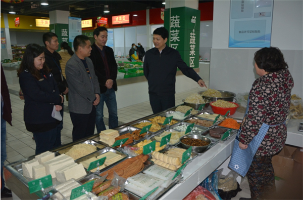 戈亮一行現(xiàn)場聽取了菜場負責人開業(yè)準備工作情況匯報,實地察看了生鮮菜場規(guī)劃布局、開業(yè)方案、食品安全臺賬、食品安全檢測室設(shè)備,與各經(jīng)營戶親切交談。
