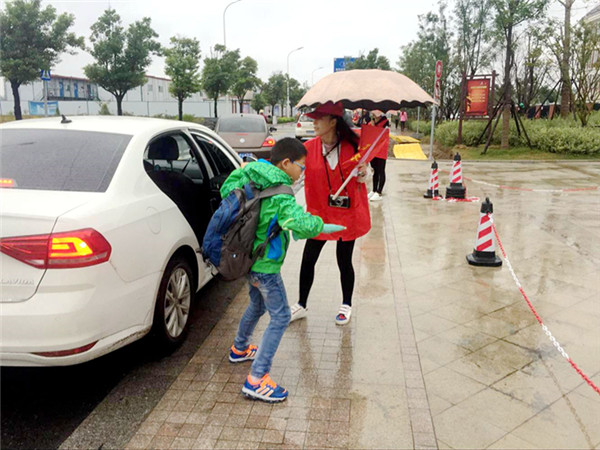 10月21日上午,第一組家長志愿者首次上崗,他們在雨中指揮車輛、疏導(dǎo)交通,用實(shí)際行動為孩子們撐起了一把“愛心保護(hù)傘”。